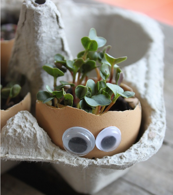 Если Вы хотите привлечь к творчеству детей, то возможно этот проект как раз то что нужно. Эта идея, похожа на предыдущую, но на этот раз на скорлупу приклеили глазки, и горшочки стали выглядеть смешно и мило, словно маленькие человечки.