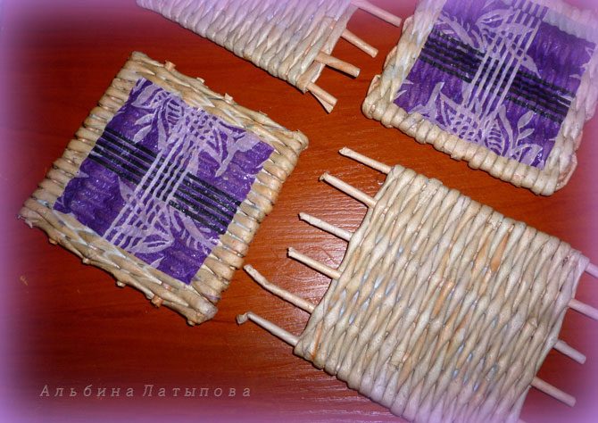 Подставки под горячее по силам и новичкам. Заготовлены трубочки, накрученные из кромки газеты, красила я их разведённой морилкой «Калужница».