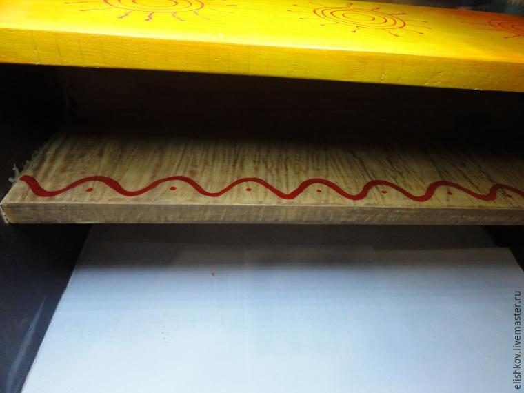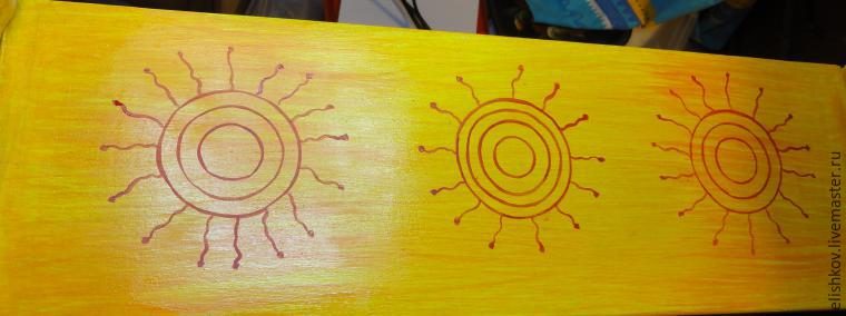 Приступим к раскрашиванию — росписи верхней полочки. Карандашом по грунту нарисовали солнышки и вперед — красить фон. Желтая краска не укрывиста, поэтому карандаш будет хорошо просвечивать, и это то, что нам и надо.