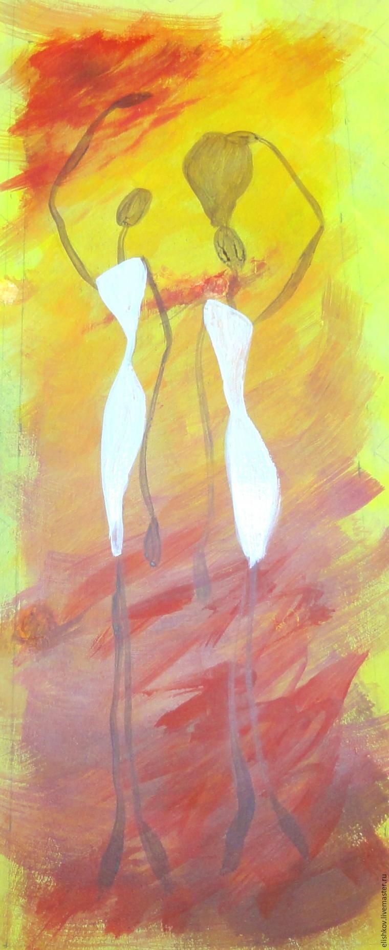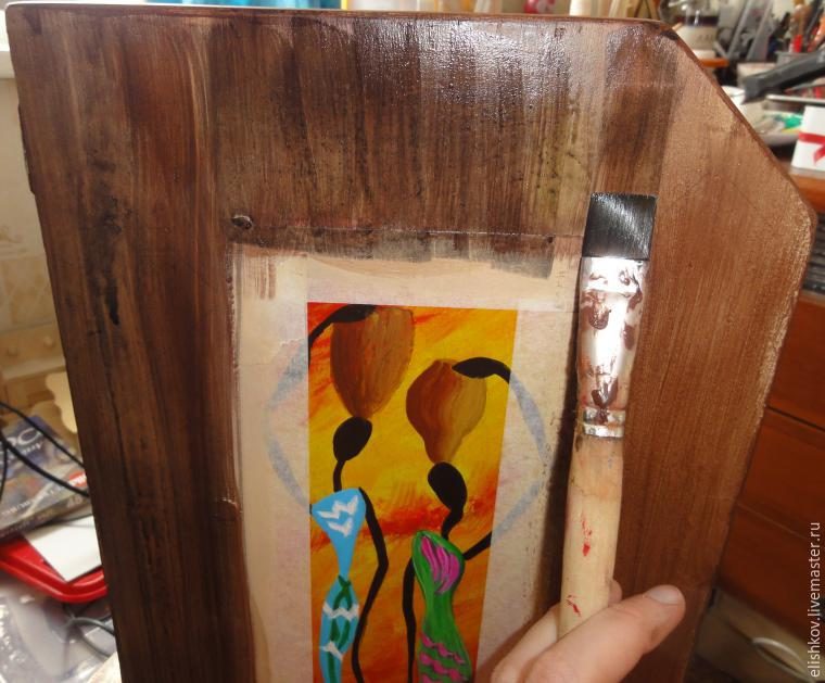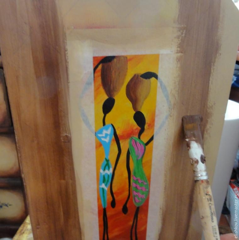 На боковинках, по центру я нарисовала африканских девушек в африканском же стиле. И сразу покрываем тонким-претонким слоем лимонно-желтой краски. Сейчас начнем имитировать африканское дерево. А это мне больше всего нравится делать тонкими прозрачными слоями.