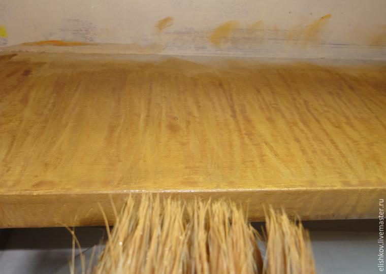 Слой лимонной желтой, слой охры, затем слой сильно разбавленной зеленой, потом разбавленной умбры жженой… Представляем себе, какими оттенками должно играть африканское дерево, такими и красим. Кисточку берем пошире и неновую, чтобы волосинки торчали разной длины. Бороздки в краске нам только на радость.