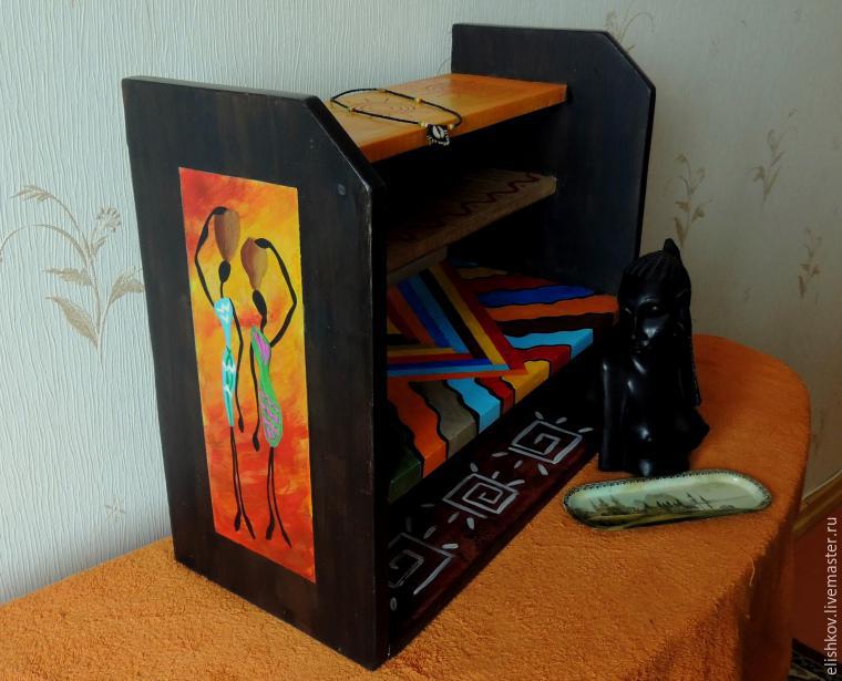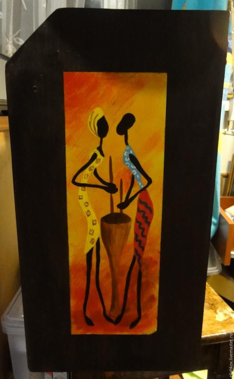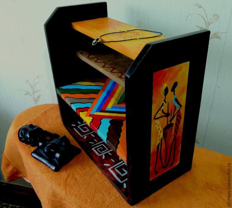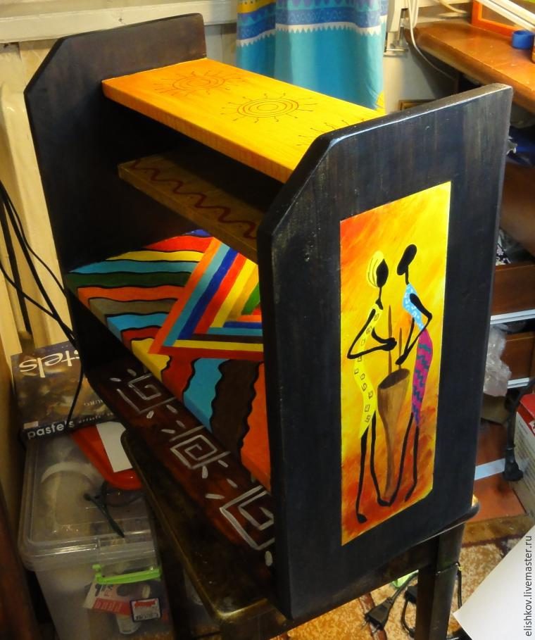 Нашлась у меня в завалах старая-престарая полка! Решила превратить ее в африканскую. Люблю я этот стиль. Мне нравится сочетание цветов и насыщенные краски, которые используют африканцы. У них не повторяется орнамент в одежде, и все цвета подобраны с большим вкусом.