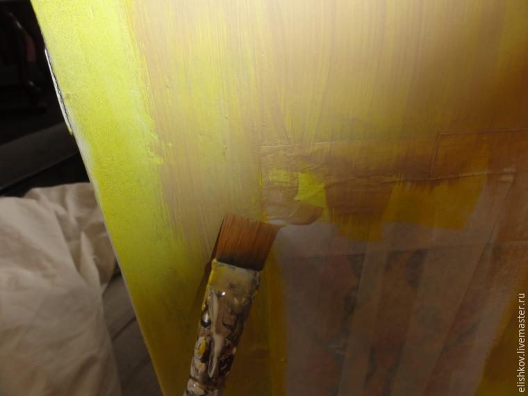 Прошу внимания на кисть! Строительная, волосины торчат и разной длины. Сейчас будем делать сложный фон и текстуру. Захотелось сделать с полосочками-бороздками разных желтых оттенков.