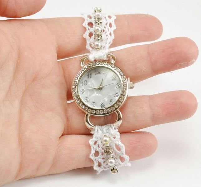 Нет ничего женственнее и нежнее подобного дуэта: кружева + жемчуга. Для украшения из камней лучше выбирать небольшой браслетик, который потом легко посадить на клей. Не забудьте о застёжке в тон.
