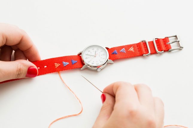 Идеальное и креативное решение для недорогих часов с обычным ремешком-лентой. Правда придётся попотеть в поисках мулине и вспоминая уроки вышивания в школе, но это ничто по сравнению с итогами проекта. Вы можете воспользоваться одним из этих 3 дизайнов, или придумать свой, использовать любимые цвета и вообще, креативить сколько душе угодно.