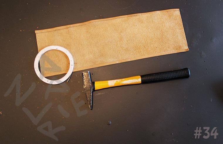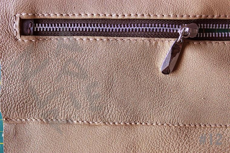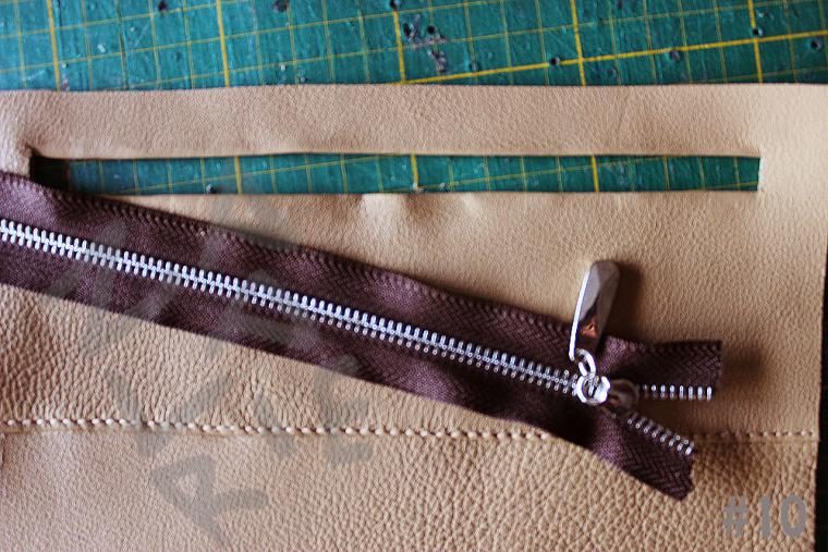 Если уровень вашего мастерства пока не позволяет совершать такие операции – не ломайте голову и просто вшейте молнию в обрезку. Если процесс спуска кожи вам знаком – утончите кожу по краям подгибки, проклейте ее скотчем для кожи (или клеем), загните края и простучите со всех сторон молотком.
