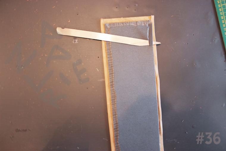 24. Приклеиваем изолон на деталь дна с изнанки, с отступом от края 1 см. По краям чуть спиливаем изолон наискосок (фото №36).