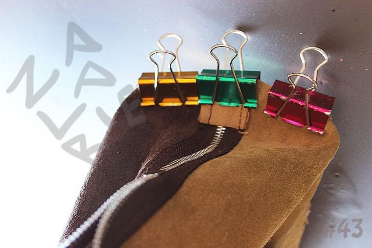 28. Последняя швейная операция – зашить торцы. Совместите с изнанки середину дна и «заглушек», которыми кончается молния (фото №42), скрепите канцелярскими клипсами (фото №43).