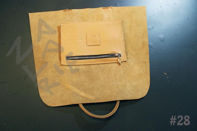 31. Осталось лишь закрыть с изнанки дно. Можно собрать из лоскутов подходящей по цвету нетолстой кожи дно в размер, так, чтобы в ширину оно закрывало швы, которыми деталь дна снаружи пришита к стенкам. Выверните сумку и резиновым клеем, или «Моментом» (говорят, последний надежнее, но я фанат резинового клея) приклейте дно, тщательно промазывая края и уголки, но не испачкав замшевую поверхность изнанку стенок. Оставьте сумку вывернутой наизнанку, просушиться, зафиксировав уголки клипсами (фото №47).