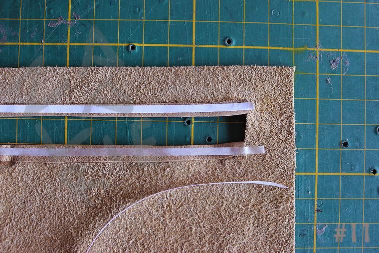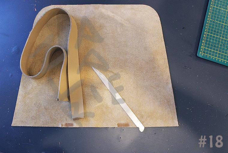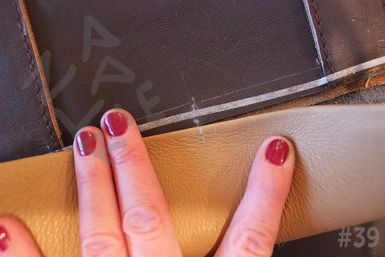12. Низ ручек (около 1 см) и места на стенках, где они будут пришиваться, стоит утончить. Ручка – 2 слоя кожи, плюс стенка – еще один слой кожи, а поверх этого будет, в конце концов, пришиваться дно. Это ощутимая толщина, которую стоит ополовинить. Низ ручек я утончаю ножом, немного разъединив склеенные детали (тем и хорош резиновый клей, что не схватывается намертво). На стенках же ручки будут пришиты в центре на расстоянии 12 см, то есть надо отмерить от центра каждой стенки по 6 см в обе стороны и спустить кожу на площади ~ 4см х 1 см. Это сложновато сформулировать, зато все понятно при взгляде на фото №18.