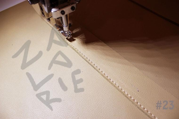 13. На фото №19 показано, как застрочить сгиб ручек верху. Отметив 20 см в центре каждой склеенной и выровненной по краям ручки, складываем ее пополам, и прошиваем нитками для отстрочки. Не забудьте поставить в начале и конце шва хорошую, ровную закрепку – ведь здесь из-за толщины большое натяжение кожи.