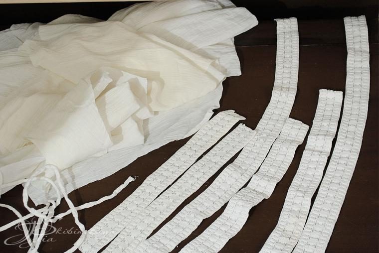 У меня уже высохла окрашенная ткань и осталось два больших кусочка и шитье не крашенных, белых. Я решила все пустить в дело.