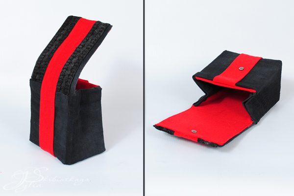 Теперь нам остается только обклеить кусочком серой ткани верхний клапан, доклеить по длине всего каркаса сумочки красную полосу (у нее края подогнуты по длине примерно на 1 см, я их не прошивала, они проклеены).