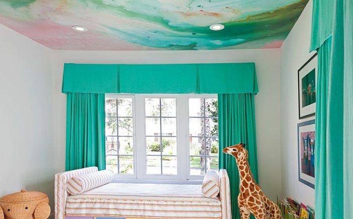 Возможно, звёздное небо не кажется слишком оригинальным решением, и в то же время не хочется ничего экстравагантного, тогда можно прибегнуть к простому трюку. Достаточно будет выбрать универсальный фон, который органично вписывается в любую тему. Дизайнеры предлагают несколько вариантов таких трансформаций. Самый простой — краска, не нужно недооценивать визуальный эффект красивого яркого потолка. Стоит отказаться от скучного белого цвета и выбрать оттенки, которые подчёркивают цветовую палитру комнаты и выбранную для неё тему. Сочетание чёрного и тёмно-серого может стать потрясающим. Пастельные тона, полоски тоже изменять потолок до неузнаваемости, сделав его стильным и уникальным.