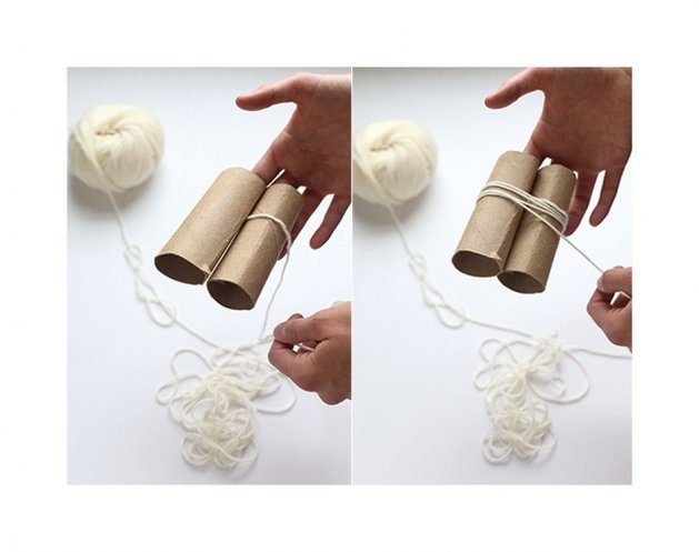 Возьмите в руку картонные рулоны, слегка сплющте их и сложите вместе. Между ними, посредине, протяните нитку и намотайте ее по кругу.