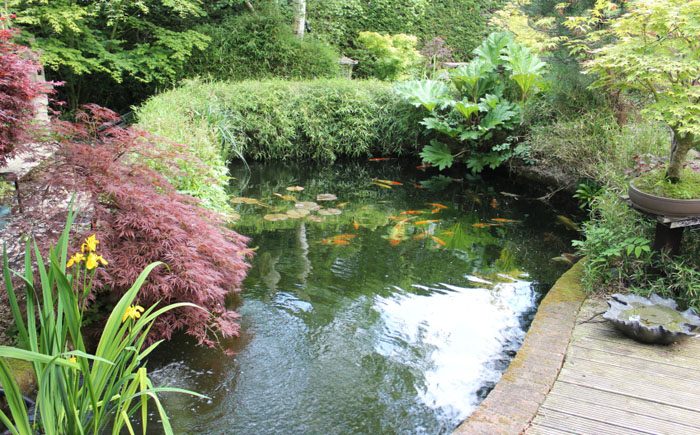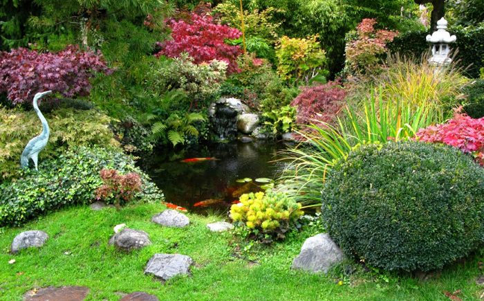 Пруд с рыбками окружен удивительными клёнами и живой изгородью.
