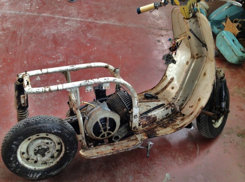 Собственно в таком виде он к нам и поступил, как видно на фото, мотороллер имел оригинальный окрас в бело-голубых тонах