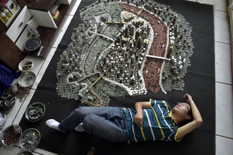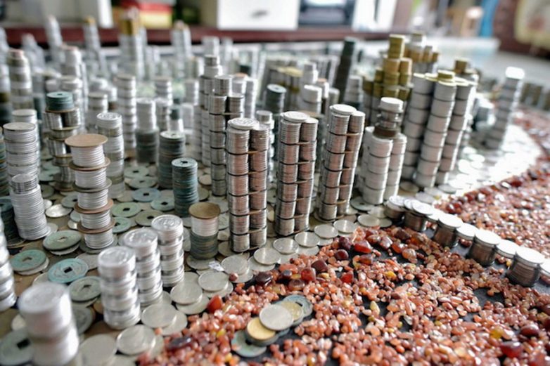 Хе Пейци (He Peixi) использовал 50 тысяч монет и камушков, а также 2 палочки для суши, чтобы воссоздать панораму города Чунцин, в котором он родился. Работая по часу в день, мужчине удался проект за месяц. Кропотливая работа!