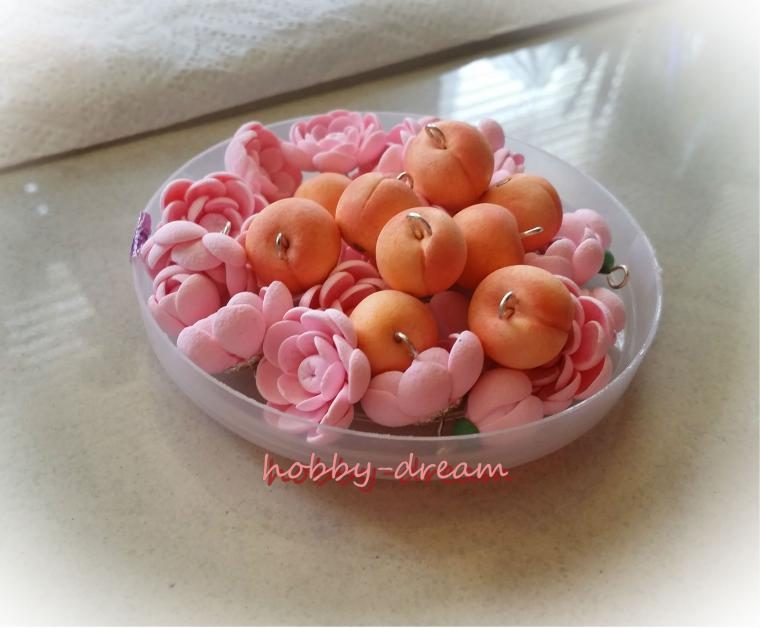 Для персиков мы берем белую глину и по небольшому кусочку ярко-розовой и ярко-оранжевой глины. Смешиваем.