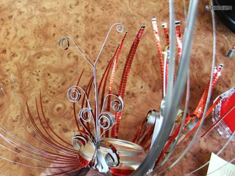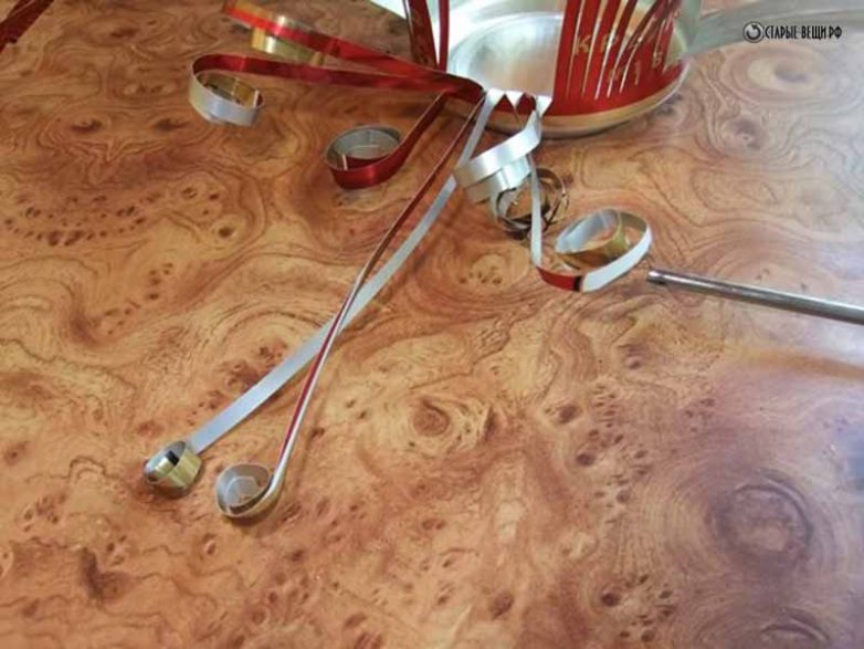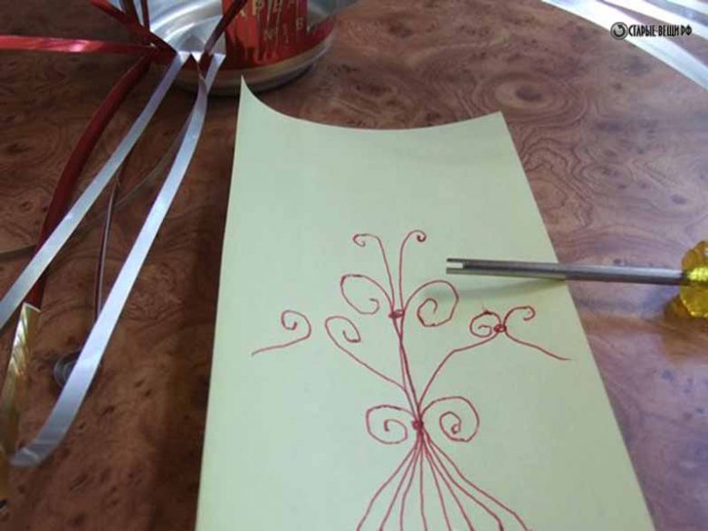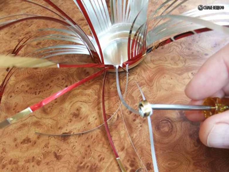 Одну часть, состоящую из 8 полосок, отогнем в сторону и начнем концы полосок завивать. Для завивки используем щелевидную отвертку. Ну а если нет таковой, можно использовать обыкновенный пинцет.