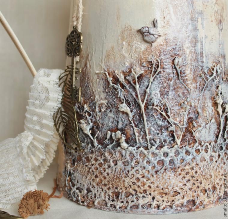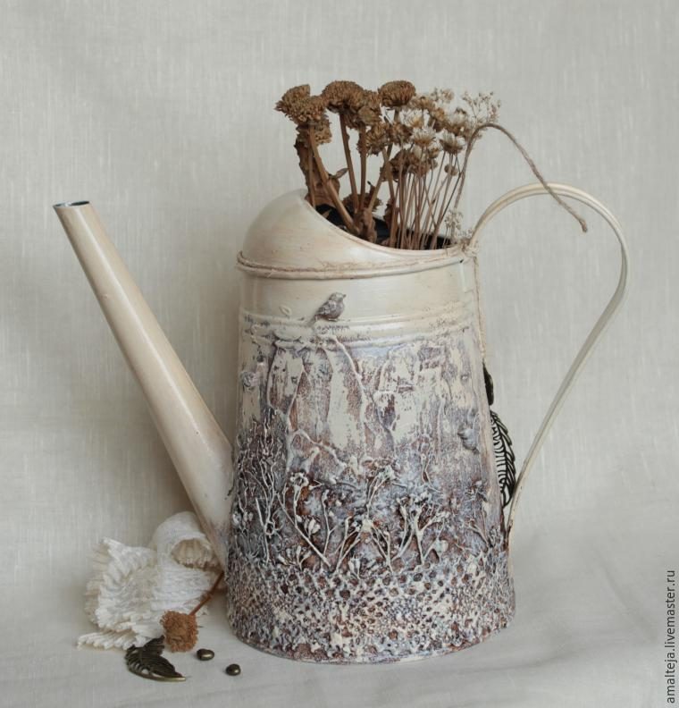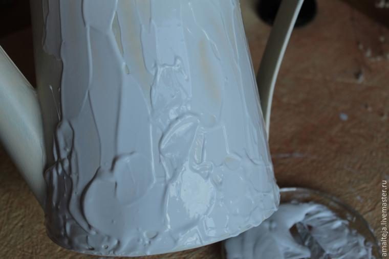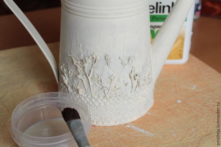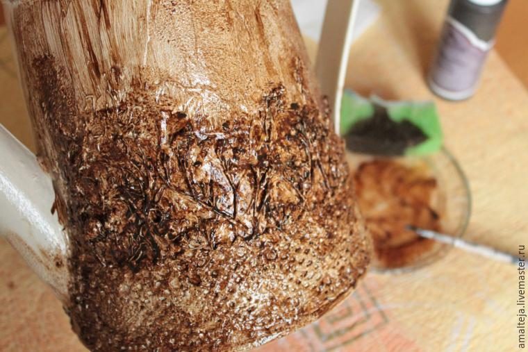 10. Далее взяла сухую щетинистую кисть, краску тэффи, кисть отбила так, чтобы она была практически сухая и прошлась еще раз по всей лейке, по выступающим рельефам и по темным местам, как бы приглушая их.