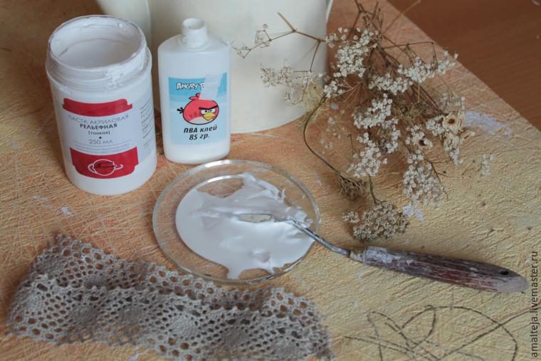 3. После высыхания краски я смешала пасту акриловую рельефную тонкую с ПВА, не пополам, а ПВА чуть меньше, примерно 30% и нанесла мастихином художественно на одной стороне лейки.