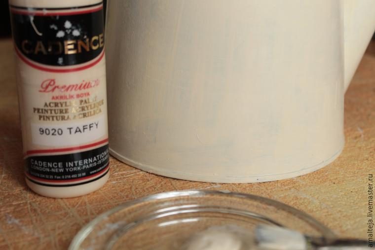2. После того, как высох второй слой, я покрываю лейку акриловой краской, у меня турецкая Cadence, цвет лен и цвет тэффи. Сейчас я пока покрашу цветом тэффи.
