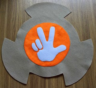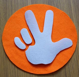 1. Вырезаем из оранжевого фетра круг нужного диаметра, из белого фетра знак «Тыдыщ».