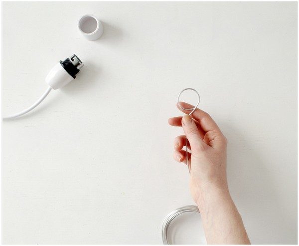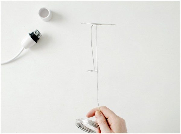 Основой может стать готовый абажур, но, если Вы хотите сделать свой собственный, возьмите: толстую проволоку, кусачки, плоскогубцы, круглогубцы, патрон со шнуром в сборе.