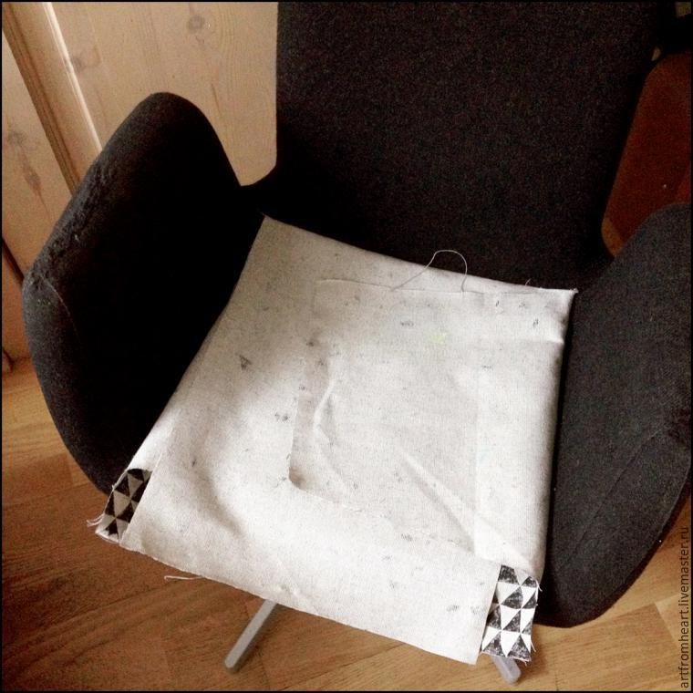 Решение: решено декорировать протертые части кресла по контуру швов льняной набивной тканью. Для этого выбираю плотный небеленый лен. Основная проблема в том, что лен — ткань не эластичная, следовательно нужно постараться сделать довольно точную выкройку. Для этого решаюсь снять родной чехол.