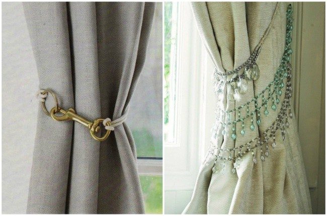 Старые ожерелья или карабин можно использовать в качестве фиксатора штор.