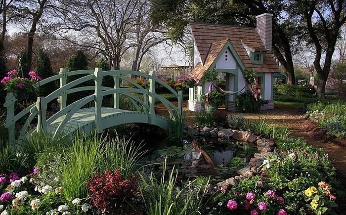 Нет ничего лучше, чем летом обустроиться в красивом внутреннем дворе или саду с пышной зеленью и благоухающими цветами. Для многих неспокойная городская жизнь в условиях стекла и бетона становится утомительной и хочется сменить её на что-то более приятное глазу и душе. Превратить обычный двор в райский уголок поможет оригинальный мостик, его можно построить даже если на территории нет ручья или пруда. Садовые мостики бывают различных размеров и форм. Главное, чтобы он вписывался в общий стиль ландшафта.