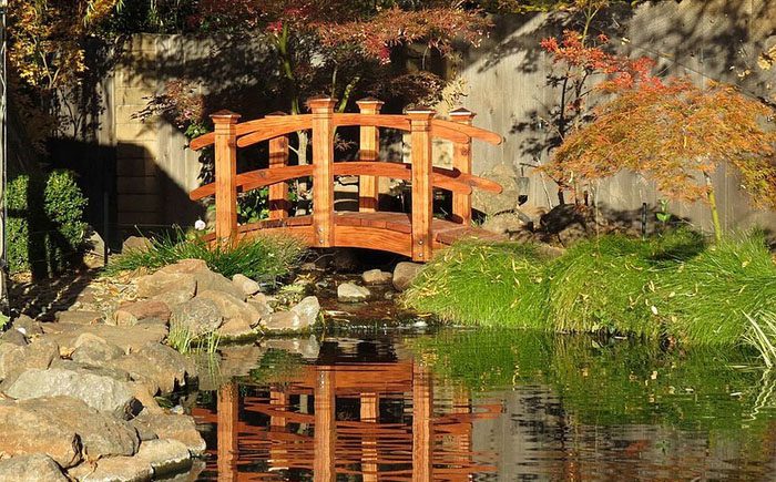 Чаще всего садовые мосты ассоциируются с восточным дизайном, в частности японскими садами, которые популярны во всём мире. Впрочем, не стоит ограничиваться лишь ими. Современный сад, оформленный в рустикальном стиле, тоже может похвастаться мостом над прудом с золотыми карпами. Дизайн мостика можно позаимствовать тоже у японцев, такая форма популярна и легко узнаваема.