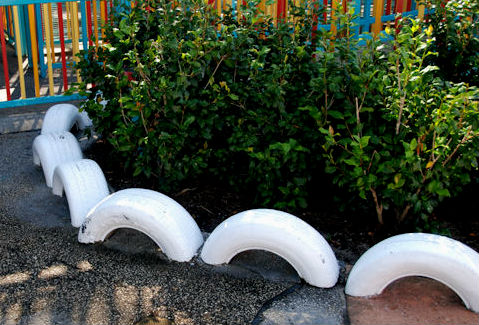 5. Качалка. Разрезав шину пополам и прибив к отрезанной части ровную дощечку можно в итоге получить отличную уличную качалку для ребенка. А ведь ее к тому же можно покрасить в любимый оттенок ребенка, и тогда он будет на ней проводить массу времени.