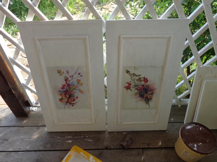 Дальше приступаем к картинкам. Картинки предварительно покрыла лаком для декупажа Таир, три слоя с промежуточной просушкой. Этот лак хорошо держит краску на картинке. После замочила картинку в тазике с теплой водой минут на 15. Далее аккуратно отрываю бумажный слой от лаковой распечатки. И клею на дверку на клей ПВА.