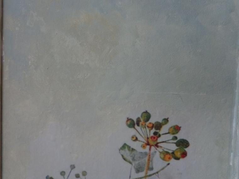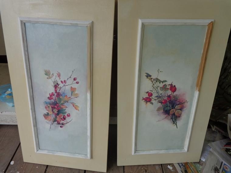 Чтобы лучше скрыть границы рисунка, нужно покрасить дверку еще раз, хотя бы выборочно, по границе и рядом. Потом подбираю цвет планок. Я это делала прямо на дверках.