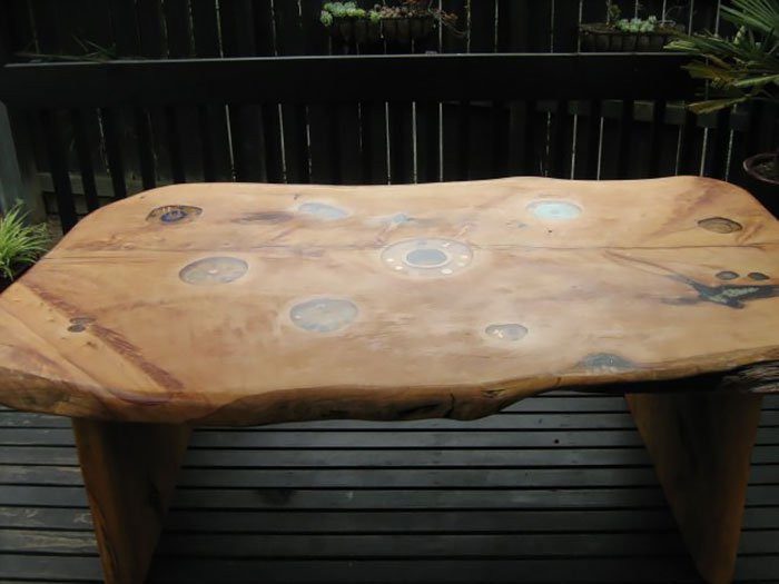 Вот как решила эту естественную проблему одна креативная деревообрабатывающая компания из Новой Зеландии: дыры и трещины их дизайнеры заполняют прозрачной эпоксидной смолой, в которую вкраплены морские ракушки, камешки, листья растений и сухоцветы или даже насекомые.