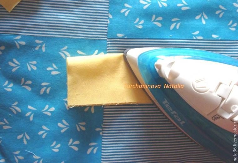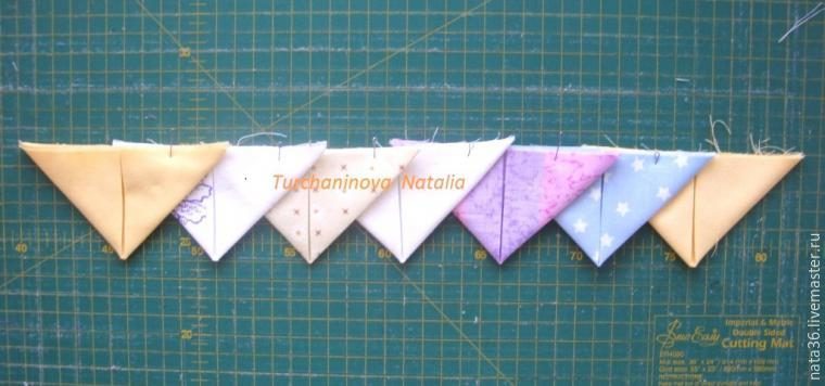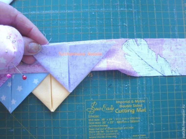 Во втором ряду уголков будет 7 штук, так диктует шахматный порядок, спорить с этим не будем: накладываем справа первый уголок на пришитую полоску ткани к первому ряду так чтобы острием уголка попасть в точку пересечения 2-х уголков предыдущего ряда, скалываем, далее второй уголок и т.д.