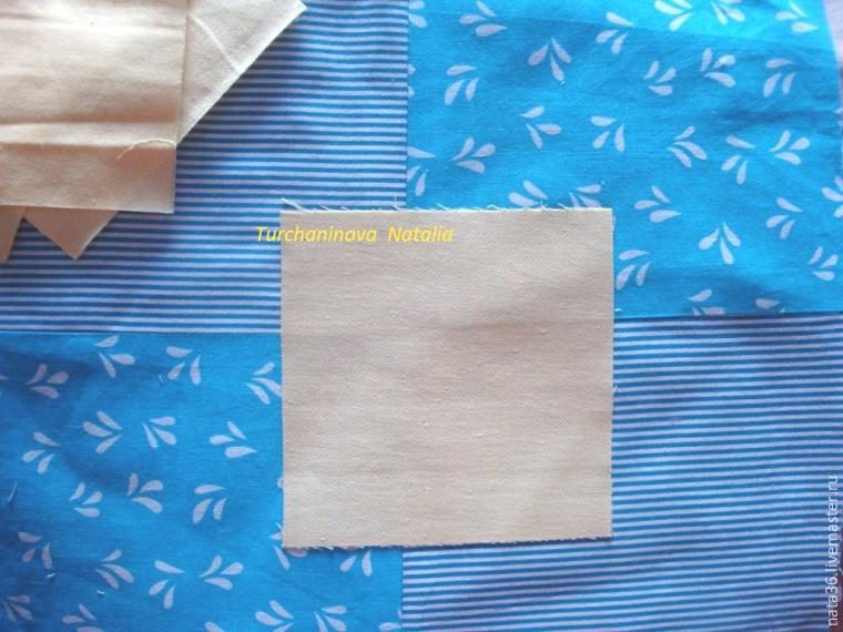 Подушечка, вернее, наволочка на подушечку, будет дополнением к детскому одеялку, оно из голубых, белых, розовато-сиреневых и желтоватых тканей. Беру эти ткани в работу и не боюсь еще какие-нибудь подходящие ткани присовокупить для пущего оживления поверхности наволочки. Размер 42 х 42, извините, сантиметров :)
