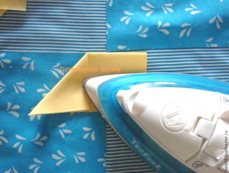 Утюгом загладим квадрат пополам, опустим уголок к срезам — загладим и второй уголок — отпарим: