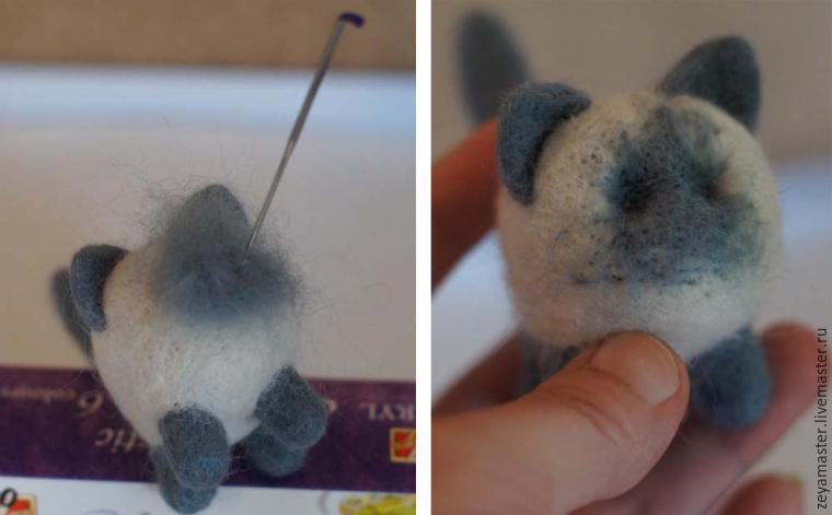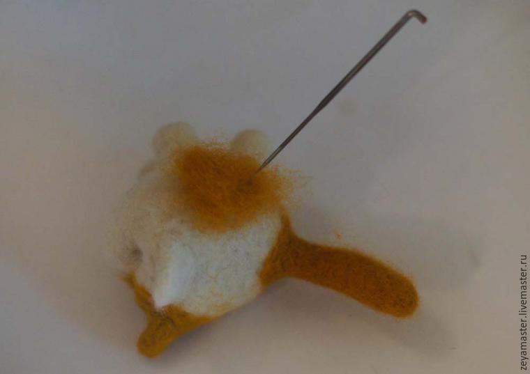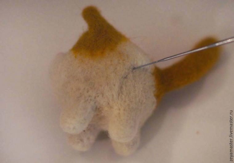 Кусок шерсти плотно сворачиваем колбаской и проваливаем, стараясь придать небольшой изкиб. Основание хвостика не заваливаем. Как ножки и ушки, проваливаем очень тщательно — потом на котике доваливать будет не очень удобно. Незаваленную шерсть у основания, по принципу ножек, расправляем в разные стороны.