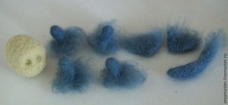 Валяем основу из любой щерсти — можно из кардочеса. Ножки, ушки и хвостик — из шерсти нужного цвета. У меня голубая для маскарадного.