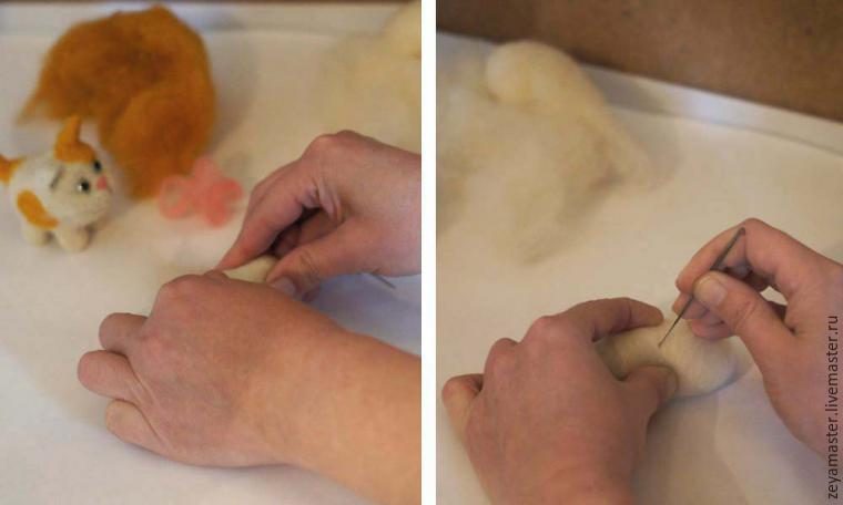 Проверяем готовность, крепко сжимая пальцами. Когда сжимается так, как показано на фото выше — еще немного не готово, надо плотнее, чтобы практически не сжимался. Если при этом котик сильно исхудает — можно добавить еще шерсти. Делаем это равномерно, как бы обворачивая в шерсть заготовку.