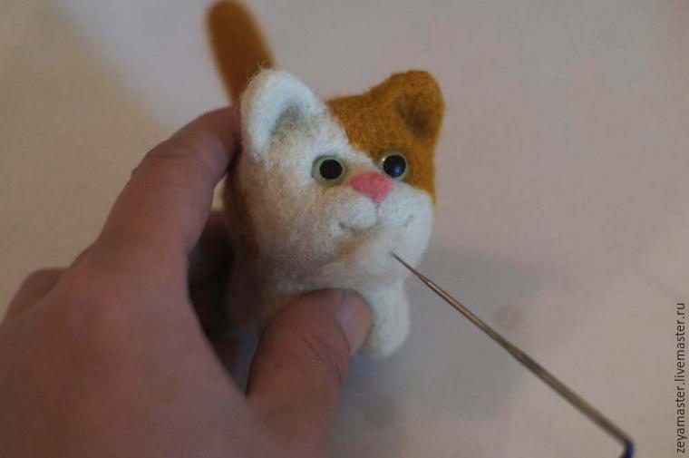 Во время окончательной обработки поверхности, я всё же решила развеселить котика, уваляв улыбку иглой. Кроху шерсти добавлю на подбородок.