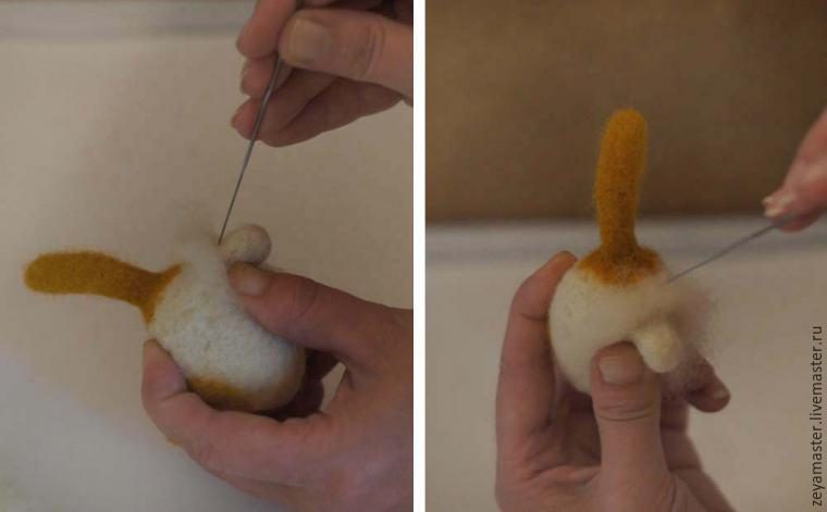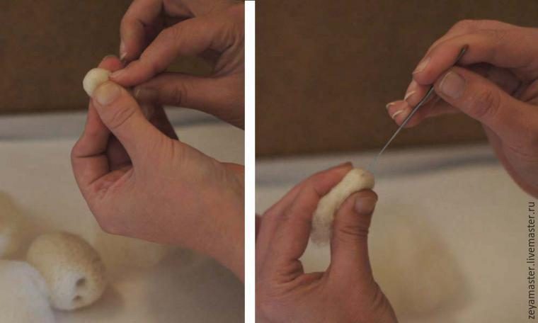 Валяем слегка вытянутый шарик, похожий на яйцо. Игла при этом входит глубоко, чтобы хорошо провалять внутри. Для плотной внутренней провалки используем такую тактику: воткнуть иглу и, не вытаскивая её наружу, сделать поступательные движения 2-4 раза из одного прокола.