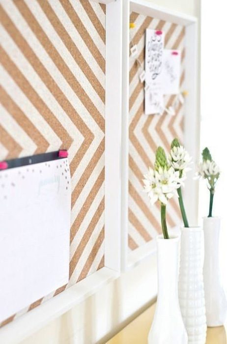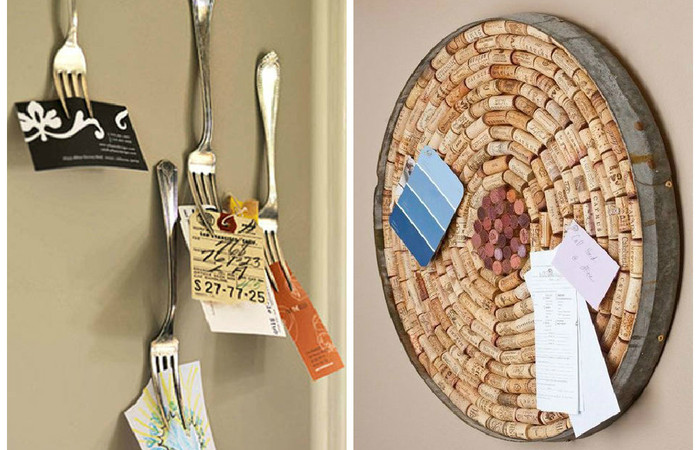Довольно необычно выглядят доски для записок, изготовленные из винных пробок. Такой аксессуар будет отлично дополнять интерьер в деревенском или скандинавском стиле. Также оригинально смотрятся доски из пробковых листов, найти которые можно в строительном магазине. Их можно закреплять на дверцах шкафов и стенах, что очень удобно на кухне и в домашнем офисе. На пробковые доски, как и на текстильные, записки фиксируются при помощи канцелярских булавок.