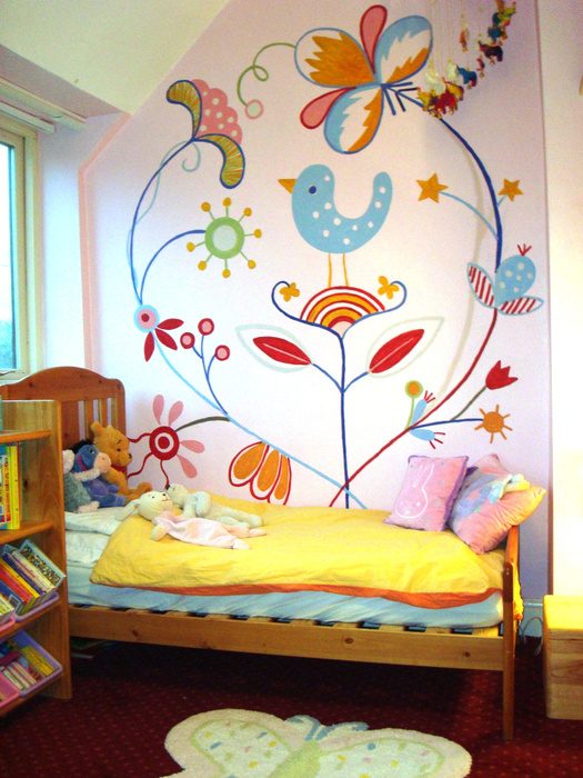 Если уж творческий порыв выходит за рамки одного постера, а стены являются прекрасным холстом для художественных экспериментов, то можно декорировать детскую настенной росписью. Наиболее уместные мотивы для комнаты малыша: цветущие деревья, зелёные лужайки, сцены из любимых мультфильмов, изображения животных, птиц, бабочек и цветов. Для настенной росписи рекомендуется использовать акриловые краски на водной основе.