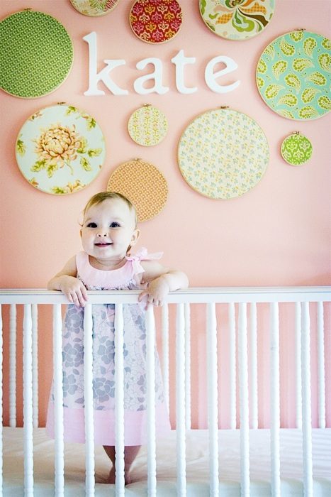 Довольно необычно смотрится декор из пялец и закреплённых на них кусочков ткани. Можно подобрать пяльцы разного диаметра и текстиль ярких оттенков, сделать из них красивую композицию, например, над кроваткой малыша.