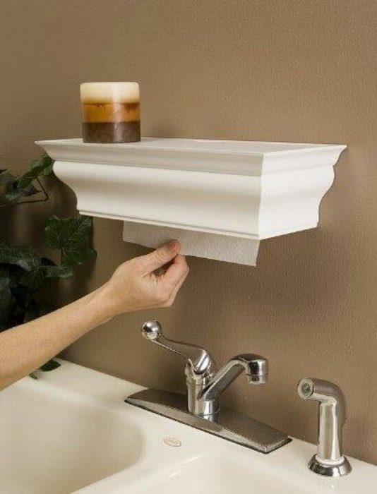 В той же ванной комнате актуально прятать под большим молдингом моток с туалетной бумагой или бумажными полотенцами. Достаточно необычное использование молдинга, которое сделает интерьер ванной или санузла оригинальным.
