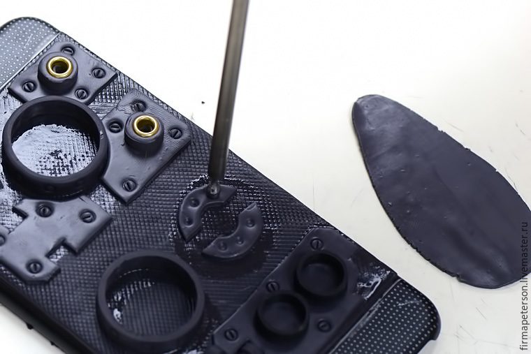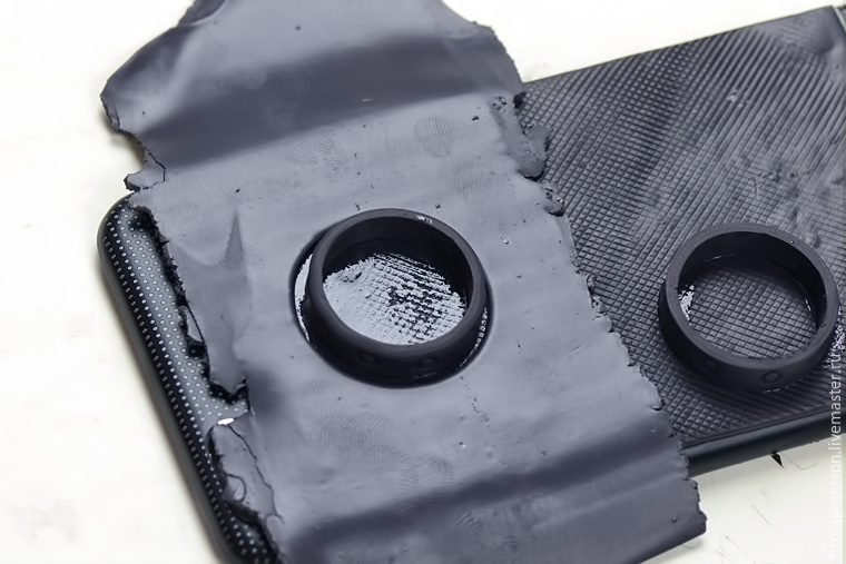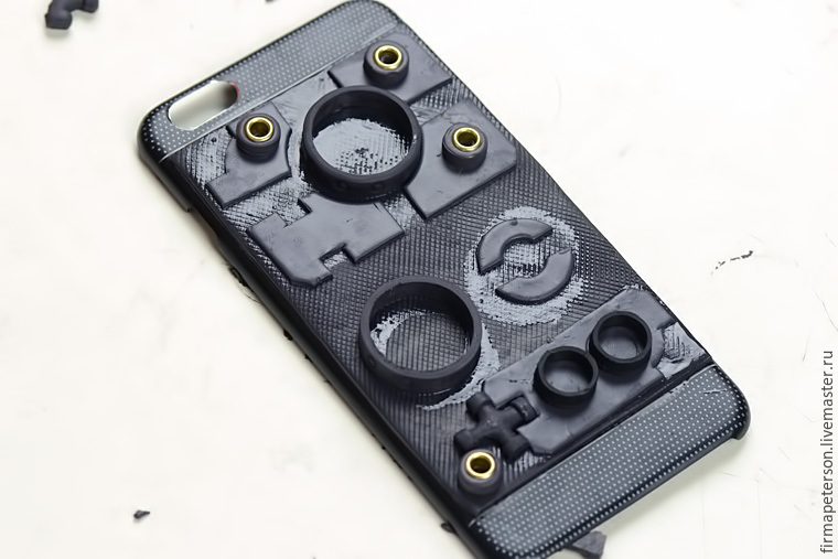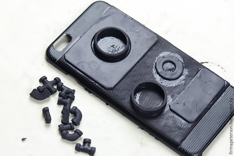 С помощью геля Fimo, приклеем к чехлу и будем запекать в течении 10 минут. У меня чехол алюминивый и перенёс тепературу в 110 градусов очень хорошо. В противном случае можно запекать лист отдельно.